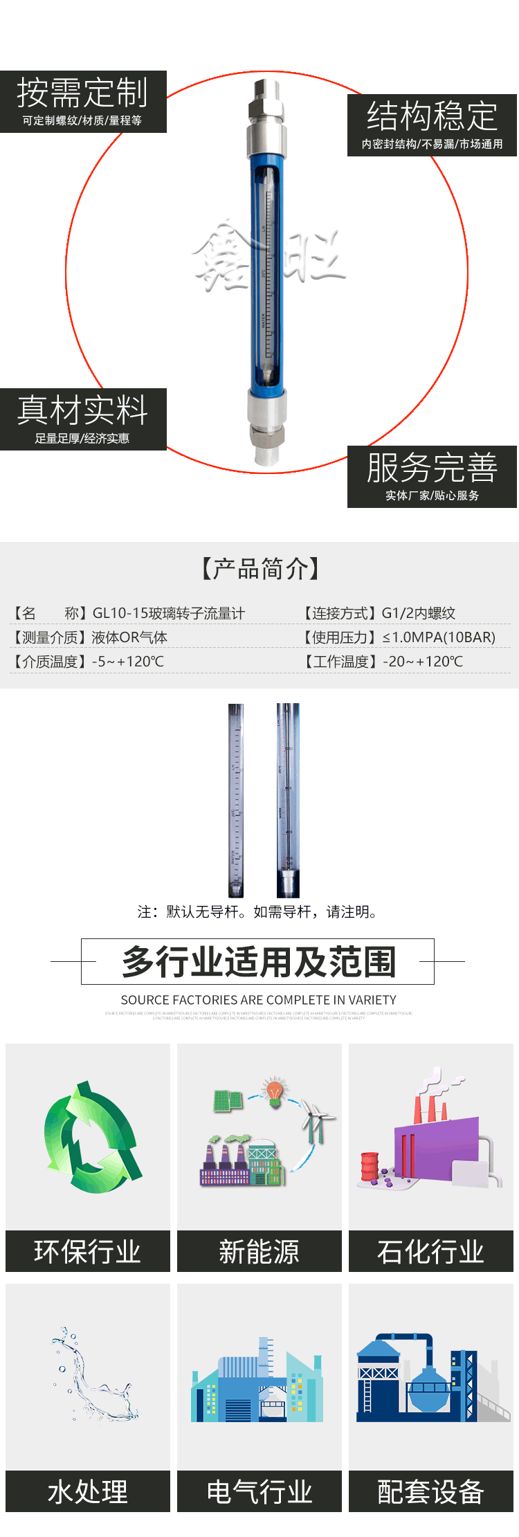 GL/RL/FL10、20、30型玻璃轉子流量計可替代引進成 套設備上的玻轉儀表,廣泛應用于化工、輕工、制藥、 食品、造紙、環(huán)保和計量測試、科研等部門,測量單相 非脈動流體(液體或氣體)的流量。