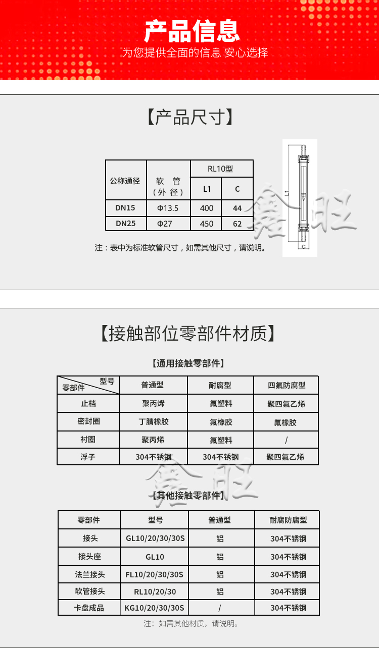 RL10-15軟管連接玻璃轉(zhuǎn)子流量計(jì),GL/RL/FL10、20、30型玻璃轉(zhuǎn)子流量計(jì)的連接有管螺紋(GL10、20、30型)、軟管(RL10、20、30型);GL10-15玻璃轉(zhuǎn)子流量計(jì),法蘭(FL10、20、30型)三種方式。其Z大工作壓力和Z高工 作溫度均高于原有相同通徑的LZB/LZJ系列玻璃轉(zhuǎn)子流量 計(jì)產(chǎn)品;分普通型(測(cè)量一般無(wú)腐蝕流體)和耐腐型(測(cè) 量的腐蝕性流體)兩種。產(chǎn)品體積小、結(jié)構(gòu)輕巧,外形 美觀,維修方便、安全可靠,安裝簡(jiǎn)單。FL10、20、30型 法蘭可轉(zhuǎn)動(dòng),與現(xiàn)場(chǎng)管道法蘭孔吻合。