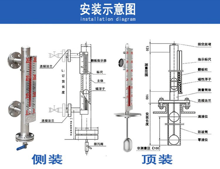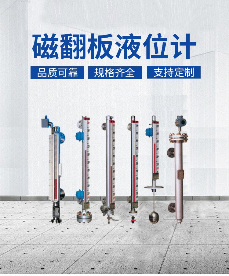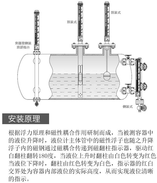 根據(jù)浮力原理,浮子在測量管內(nèi)隨液位的升降而上、下移動,浮子內(nèi)的永久磁鋼通過耦合作用,驅(qū)動紅、白色翻柱翻轉(zhuǎn)180°,液位上升時(shí)翻柱由白色轉(zhuǎn)為紅色,下降時(shí)由紅色轉(zhuǎn)為白色,從而實(shí)現(xiàn)液位指示。