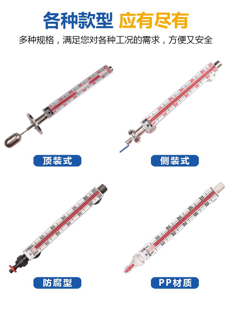5.磁翻板液位計最顯著的特點是液體介質(zhì)與指示器完全隔離,所以在任何情況下都非常安全,可靠,耐用,而且各種型號的磁翻板液位計配上液位報警、控制開關(guān),可實現(xiàn)液位或界位的上、下限越位報警,控制或連鎖。