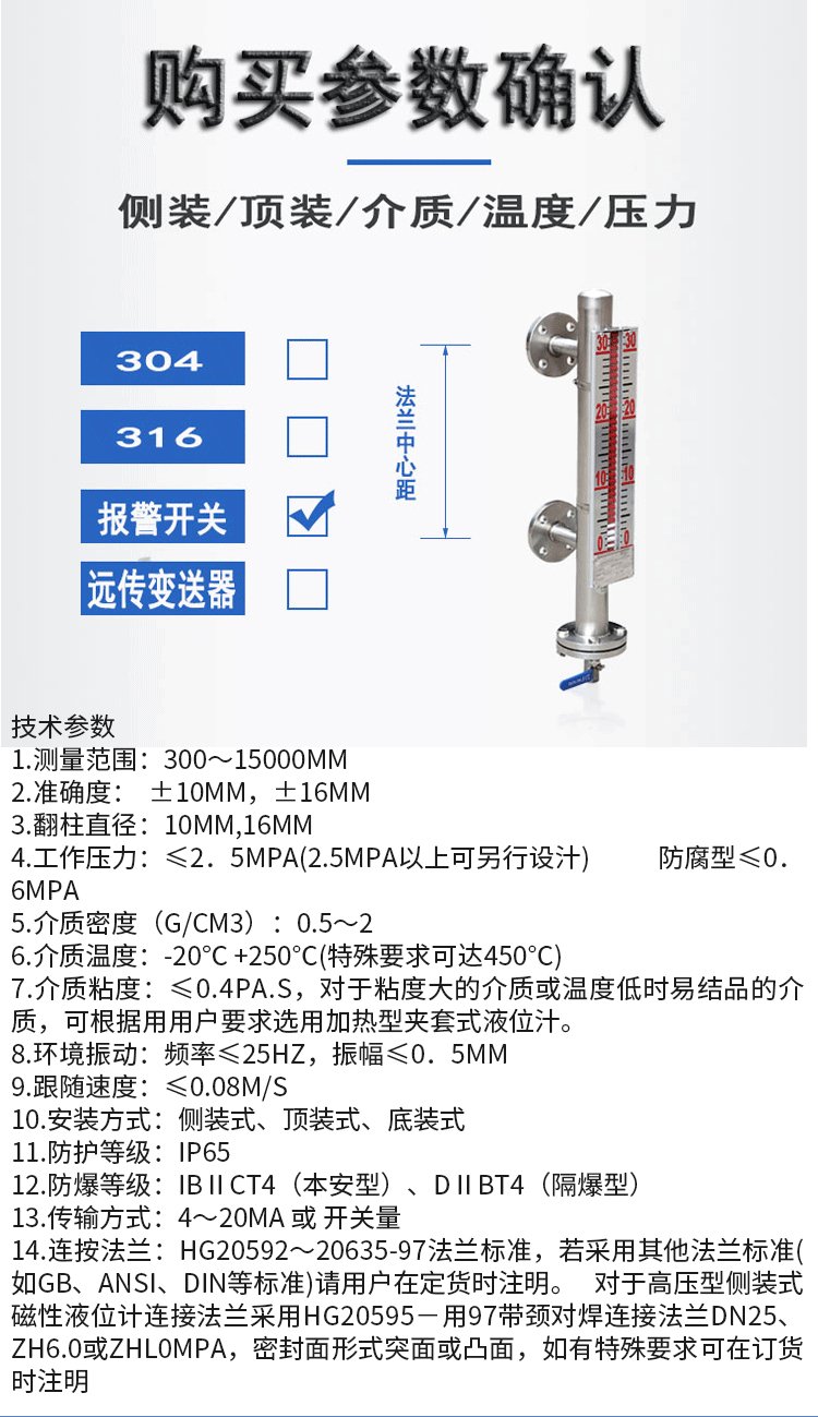 1、測量范圍:150~8000mm,對中心距超過8000mm的或遠輸條件不允許超過長度的液位計可采用分段制造。