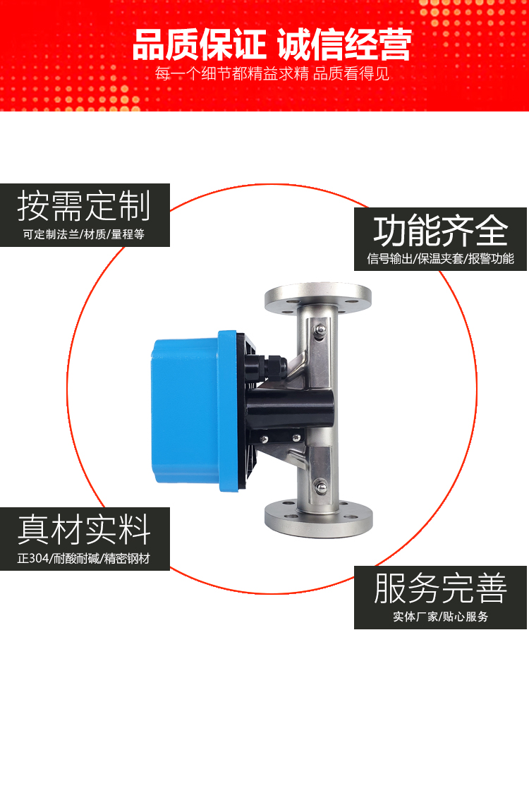 本公司生產的電遠傳型金屬管浮子流量計摒棄了連桿傳動的接觸傳遞方式,全部采用自主研發(fā)的非接觸式以MSP為核心CPU的智能變送器,極大提高了儀表的可靠性,穩(wěn)定性和精度。